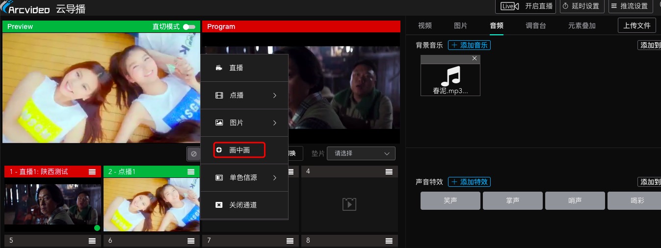 当虹云导播支持转场特效、背景音乐、画中画输出功能,丰富了云导播切换画面功能。
