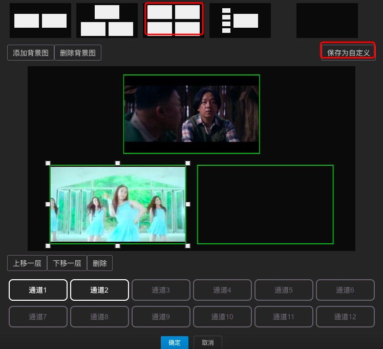 4.自定义画中画模版,绑定直播频道信号,选择窗口,双单通道进行关联绑定,确定进行保存: