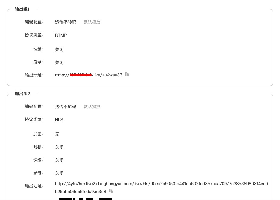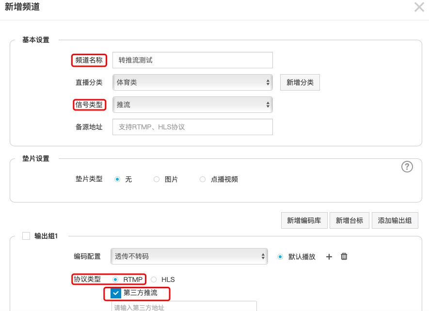 2.向第三方平台转推直播流,可选择透传转推和降码率输出,需选择rtmp输出协议,输入第三方推流地址:
