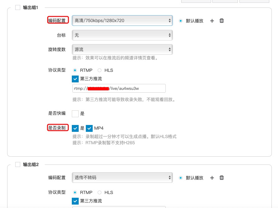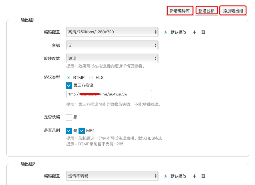 3.可根据输出直播流需求进行录制成mp4文件,录制成功的视频文件自动保存到云点播栏里,每组输出可增加不同的台标,同时转推多平台时,可选择增加多输出组(4组)进行配置。